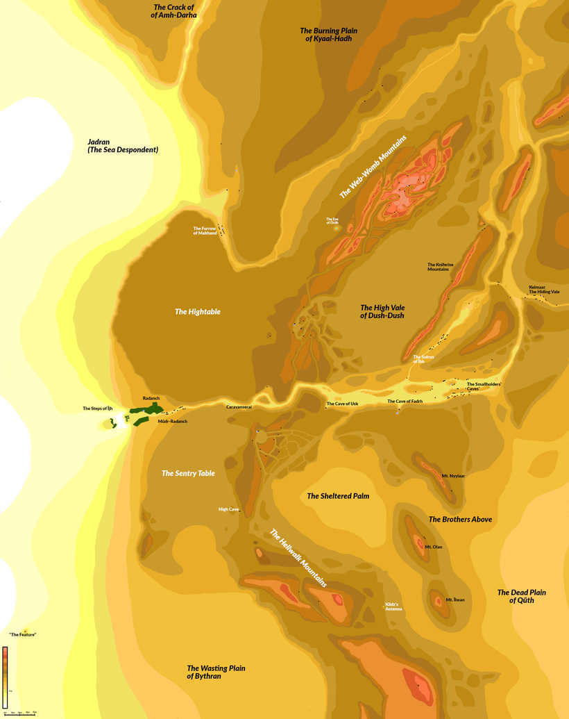 A significant part of how this venture came to be is intertwined with the development of this map. There were countless times when I hit an impasse with questions like, “how long would it take a party to get from Radanch to the Eastern Sulci?”; or, “how much will Radasol [the local sun] heat this region throughout the day?”; or, “how steep is this canyon wall/mountain range/perilous drop?” The saying goes, “the map is not the territory,” but in this case it essentially is.